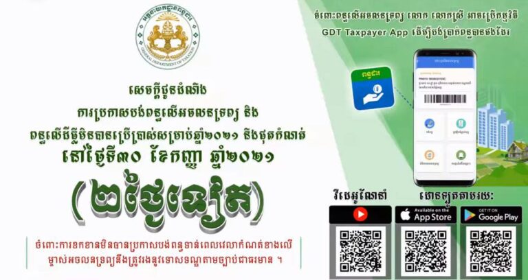សូមមេត្តារួសរាន់ ការប្រកាសបង់ពន្ធលើអចលនទ្រព្យ និងពន្ធលើដីធ្លីមិនបានប្រើប្រាស់សម្រាប់ឆ្នាំ ២០២១ នៅសល់តែ ២ថ្ងៃទៀតតែប៉ុណ្ណោះ!
