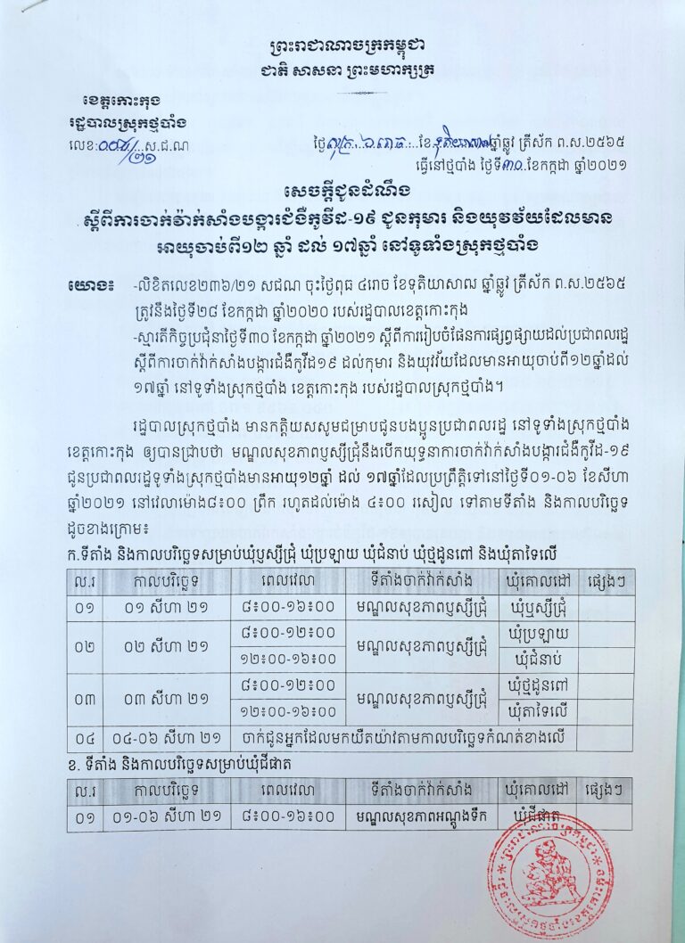 សេចក្តីជូដំណឹងស្តីពីការចាក់វ៉ាក់សាំងបង្ការជំងឺកូវីដ១៩ ជូនក្មួយៗដែលជាកុមារា កុមារី និងយុវជនដែលមានអាយុចាប់ពី១២ ឆ្នាំ ដល់ ១៧ ឆ្នាំ នៅទូទាំងស្រុកថ្មបាំង