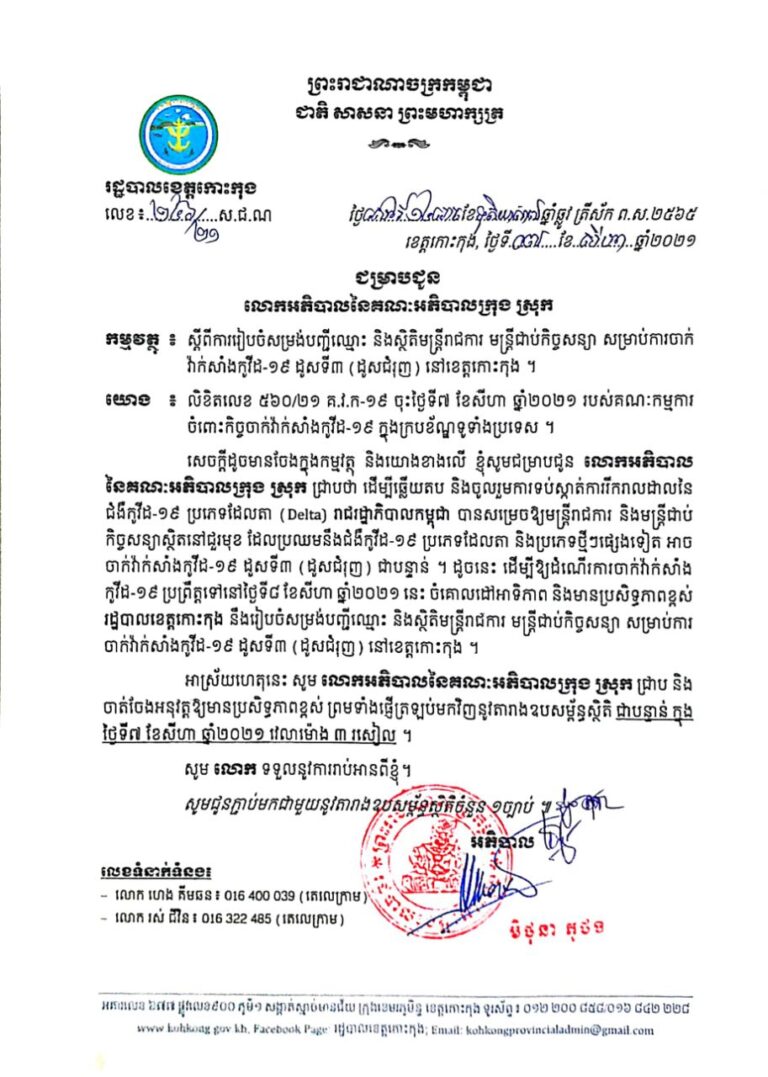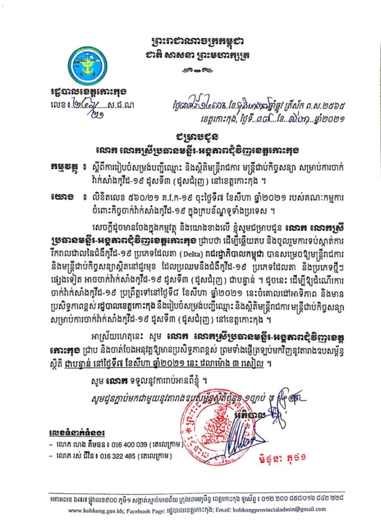 សេចក្តីជូនដំណឹង ស្តីពីការរៀបចំសម្រង់បញ្ជីឈ្មោះ និងស្ថិតិមន្ត្រីរាជការ មន្ត្រីជាប់កិច្ចសន្យាសន្យា សម្រាប់ការចាក់វ៉ាក់សាំងកូវីដ-១៩ ដូសទី៣(ដូសជំរុញ) នៅខេត្តកោះកុង