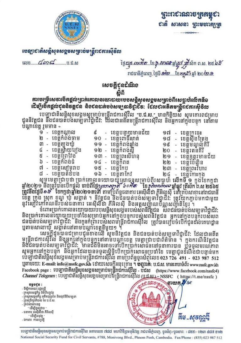 មន្ទីរសង្គមកិច្ច អតីតយុទ្ធជន និងយុវនីតិសម្បទា ខេត្តកោះកុង សេចក្ដីជូនដំណឹងស្ដីពីការបម្រើសេវាបើកផ្ដល់ប្រាក់គោលនយោបាយរបបសន្តិសុខសង្គមសម្រាប់ពីរសប្ដាហ៍លើកទី១ ដើម្បីបើកផ្ដល់ជូននិវត្តជន និងជនបាត់បង់សម្បទាវិជ្ជាជីវៈ ដែលជាអតីតមន្រ្តីរាជការស៊ីវិល
