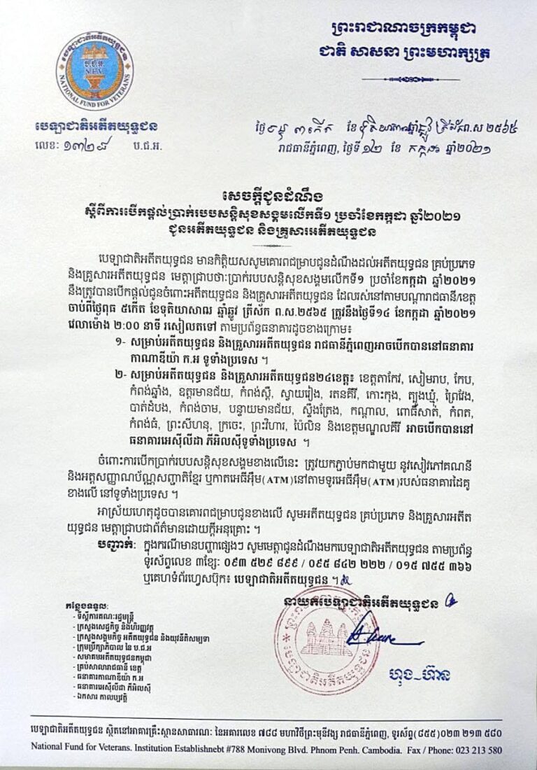 មន្ទីរសង្គមកិច្ច អតីតយុទ្ធជន និងយុវនីតិសម្បទា ខេត្តកោះកុង សេចក្ដីជូនដំណឹងស្ដីពីការបើកផ្ដល់ប្រាក់របបសន្តិសុខសង្គមលើកទី១ ប្រចាំខែកក្កដា ឆ្នាំ២០២១ ជូនអតីតយុទ្ធជន និងគ្រួសារអតីតយុទ្ធជន
