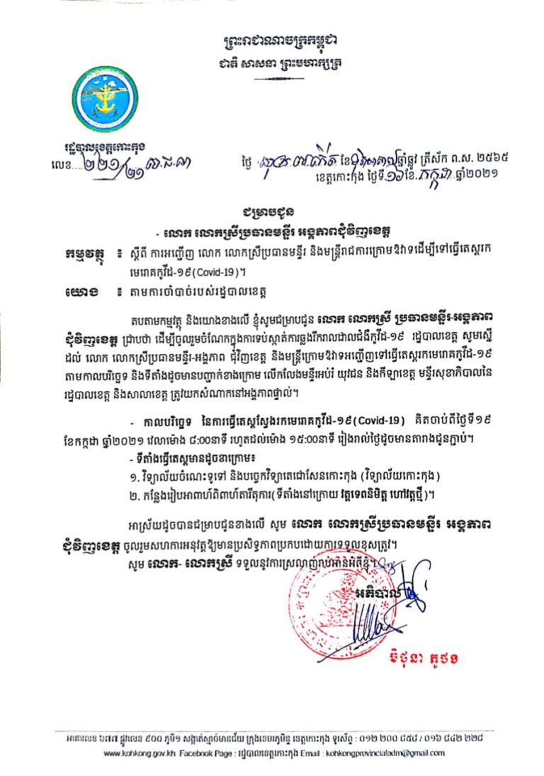 សេចក្តីជូនដំណឹង ស្តីពីការអញ្ជើញថ្នាក់ដឹកនាំ និងមន្ត្រីរាជការតាមបណ្តាមន្ទីរ អង្គភាព ជុំវិញខេត្ត ដើម្បីទៅធ្វើតេស្តរកមេរោគកូវីដ-១៩ (Covid-19)