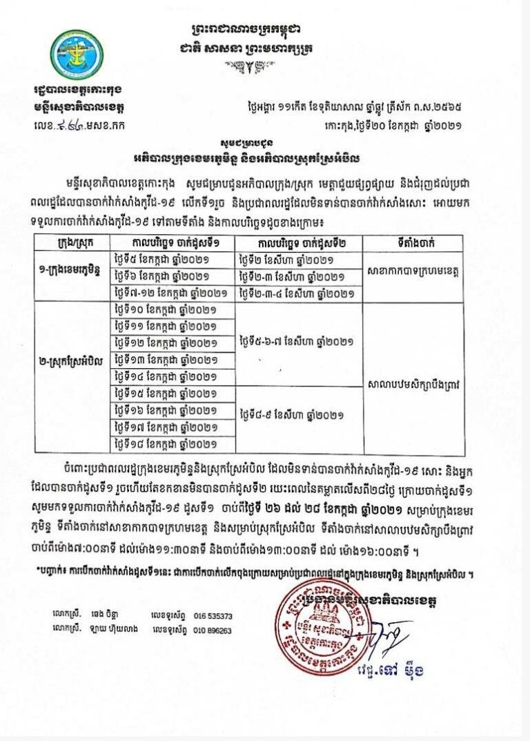 សូមជូនដំណឹងបងប្អូនដែលបានចាក់ដូសទី១ កាលពីថ្ងៃទី២០ និង២១ ខែមិថុនា ឆ្នាំ២០២១នេះ សូមអញ្ជើញមកចាក់វ៉ាក់សាំងដូសទី២ នៅថ្ងៃទី១៨ ខែកក្កដា ឆ្នាំ២០២១ នៅសាខាកាកបាទក្រហមខេត្តកោះកុង