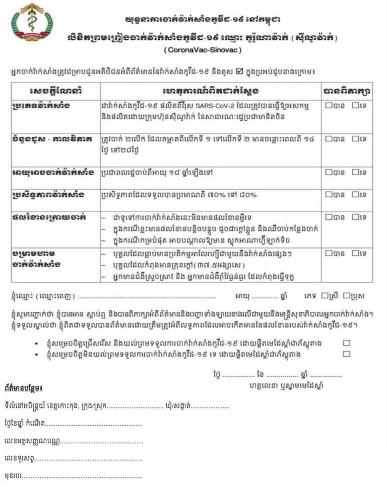 មន្ទីរសុខាភិបាលខេត្តកោះកុង សូមបញ្ជាក់បងប្អូនប្រជាពលរដ្ឋ ទាក់ទងនឹងការវ៉ាក់សាំងកូវីដ-១៩ មានភាពងាយស្រួល៖+សូមថតចម្លង ទំរង់នេះរួចបំពេញ ឱ្យបានរួចរាល់ មុនពេលទៅចាក់វ៉ាក់សាំង (១ច្បាប់) +សូមថតចម្លង អត្តសញ្ញាណបណ្ណ ឬលិខិតឆ្លងដែន ឬសំបុត្រកំណើតឬសៀវភៅស្នាក់នៅ ឬឆាយា (១ច្បាប់) +រូបថត ៤គុណ ៦ (១សន្លឹក)