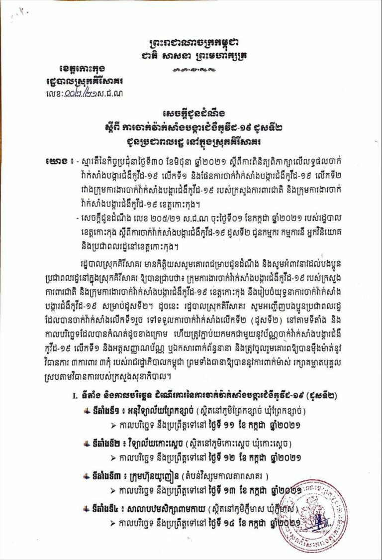សេចក្តីជូនដំណឹង ស្ដីពីការចាក់វ៉ាក់សាំងបង្ការជំងឺកូវីដ-១៩ ដូសទី២ ជូនប្រជាពលរដ្ឋ នៅក្នុងស្រុកគិរីសាគរ ខេត្តកោះកុង