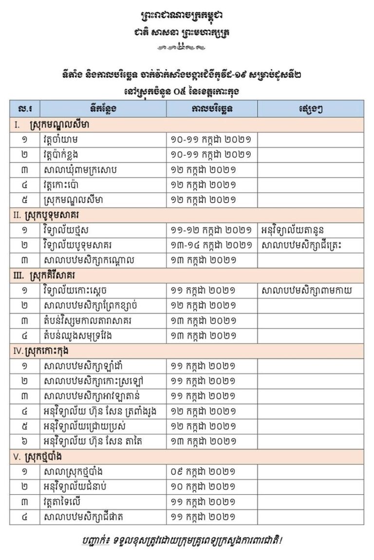 ទីតាំង និងកាលបរិច្ឆេទ ចាក់វ៉ាក់សាំងបង្ការជំងឺកូវីដ-១៩ សម្រាប់ជួសទី២ នៅស្រុកចំនួន ០៥ នៃខេត្តកោះកុង