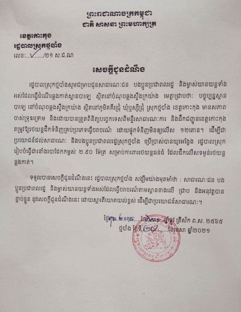 សេចក្តីជូនដំណឹងអំពីការផ្អាកមិនឲរថយន្តធុនធ្ងន់លើពី១២តោន លើស្ពានស្ទឹងក្រយ៉ាង ស្ថិតនៅភូមិគគីរជ្រុំ ឃុំឬស្សីជ្រុំ ស្រុកថ្មបាំង ខេត្តកោះកុង