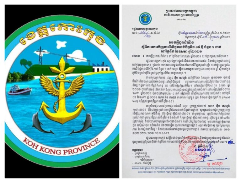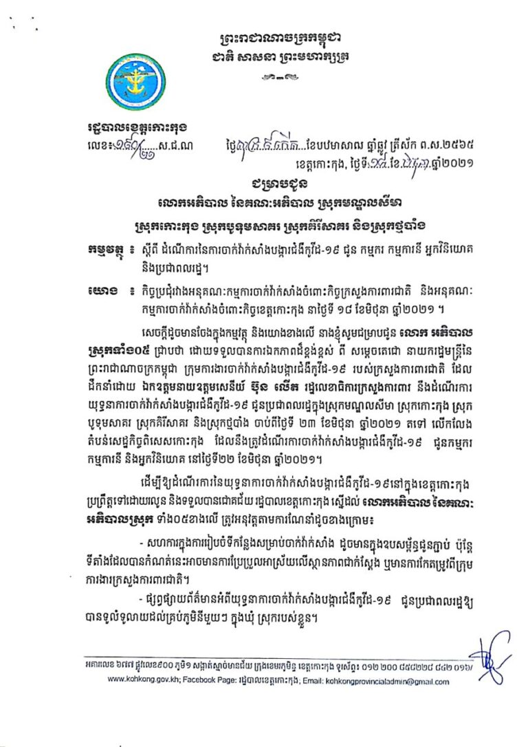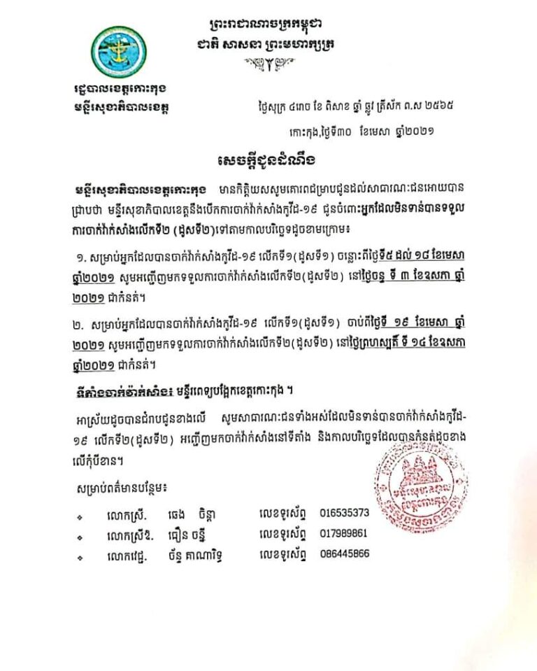 សេចក្តីជូនដំណឹង របស់រដ្ឋបាលខេត្តកោះកុង ស្តីពីដំណើរការនៃការចាក់វ៉ាក់សាំងបង្ការជំងឺកូវីដ-១៩ ជូនកម្មករ កម្មការីនី អ្នកវិនិយោគ និងប្រជាពលរដ្ឋ