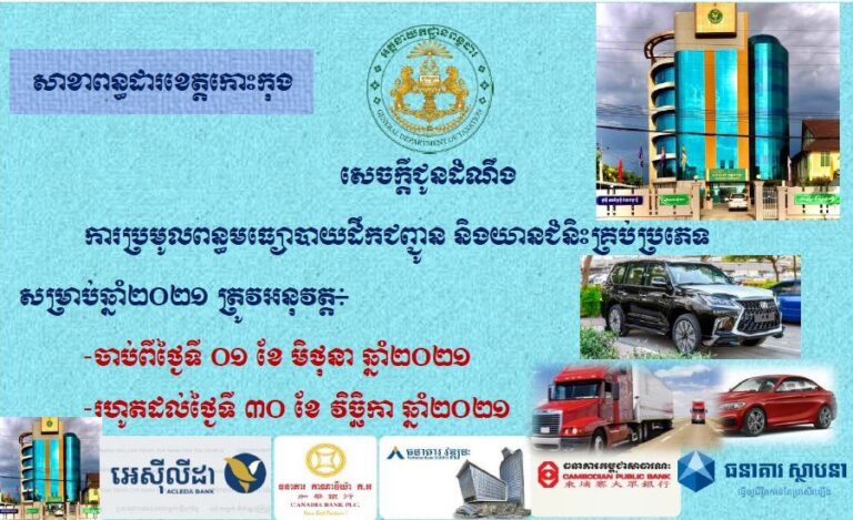 សេចក្តីជូនដំណឹងស្តីពីការប្រមូលពន្ធលើមធ្យោបាយដឹកជញ្ជូននិងយានជំនិះគ្រប់ប្រភេទសម្រាប់ឆ្នាំ២០២១