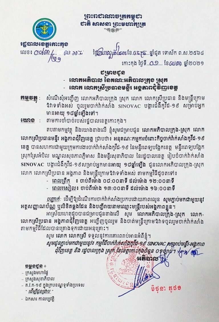 លិខិតអញ្ជើញ លោកអភិបាលក្រុង ស្រុក លោក លោកស្រី ប្រធានមន្ទីរ និងមន្ត្រីក្រោមឱវាទទាំងអស់ ចូលរួមចាក់វ៉ាក់សាំង SINOVAC បង្ការជំងឺកូវីដ-១៩ សម្រាប់អ្នកមានអាយុ ១៨ ឆ្នាំឡើងទៅ