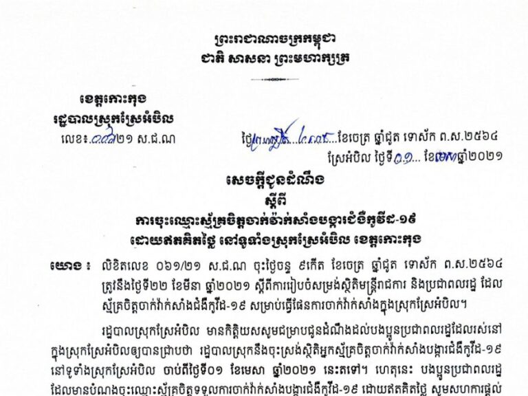 សេចក្ដីជូនដំណឹង ស្ដីពីការចុះឈ្មោះស្ម័គ្រចិត្តចាក់វ៉ាកសាំងបង្ការជំងឺកូវីដ-១៩ នៅទូទាំងស្រុកស្រែអំបិល ខេត្តកោះកុង
