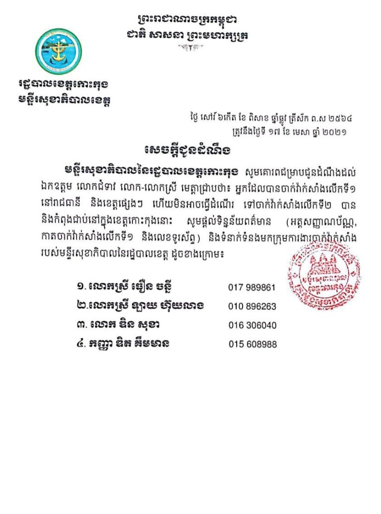 សេចក្តីជូនដំណឹង ចំពោះអ្នកដែលចាក់វ៉ាក់សាំងលើកទី១ នៅរាជធានី ខេត្តផ្សេងៗ ហើយមិនអាចធ្វើដំណើរ ទៅចាក់វ៉ាក់សាំងលើកទី២