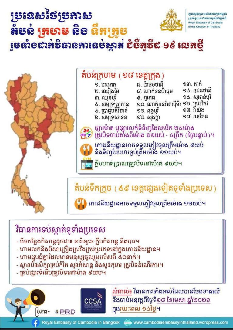 សូមគោរពជូនបងប្អូនកម្ពុជា ដែលបានរស់នៅប្រទេសថៃ នូវសេចក្តីជូនដំណឹងស្តីពីប្រទេសថៃប្រកាសតំបន់ក្រហម និងទឹកក្រូច ព្រមទាំងដាក់វិធានការទប់ស្កាត់ ជំងឺកូវីដ១៩ រលកថ្មី !