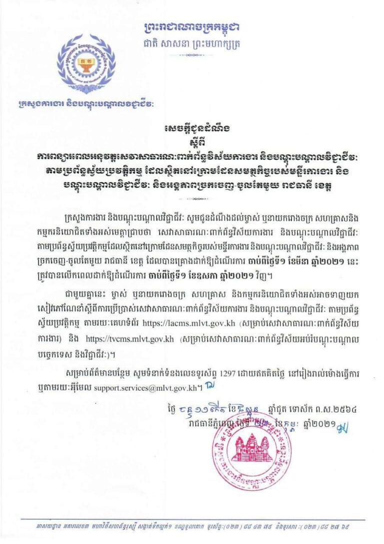 សេចក្តីជូនដំណឹង ស្ដីពីការពន្យារពេលអនុវត្តសេវាសាធារណៈពាក់ព័ន្ធវិស័យការងារ និងបណ្តុះបណ្តាលវិជ្ជាជីវៈ តាមប្រព័ន្ធស្វ័យប្រវត្តិកម្ម ដែលស្ថិតក្រោមដែនសមត្ថកិច្ចមន្រ្តីការងារ បណ្តុះបណ្តាលវិជ្ជាជីវៈ និងអង្គភាពច្រកចេញ-ចូលតែមួយ រាជធានី ខេត្ត