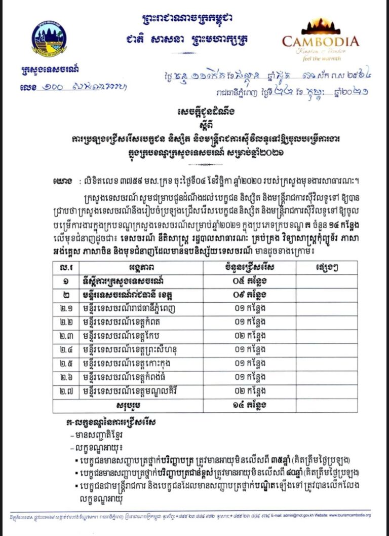 សេចក្តីជូនដំណឹងស្តីពីការប្រឡងជ្រើសរើសក្របខណ្ឌក្រសួងទេសចរណ៍