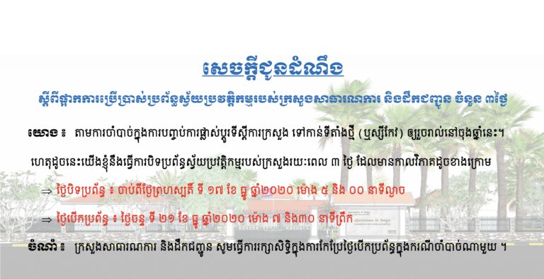 មន្ទីរសាធារណការ និងដឹកជញ្ជូនខេត្តកោះកុង សូមជូនដំណឹង ស្តីពីផ្អាកការប្រើប្រាស់ប្រព័ន្ធស្វ័យប្រវត្តិកម្មរបស់ក្រសួងសាធារណការ និងដឹកជញ្ជូន ចំនួន ៣ថ្ងៃ