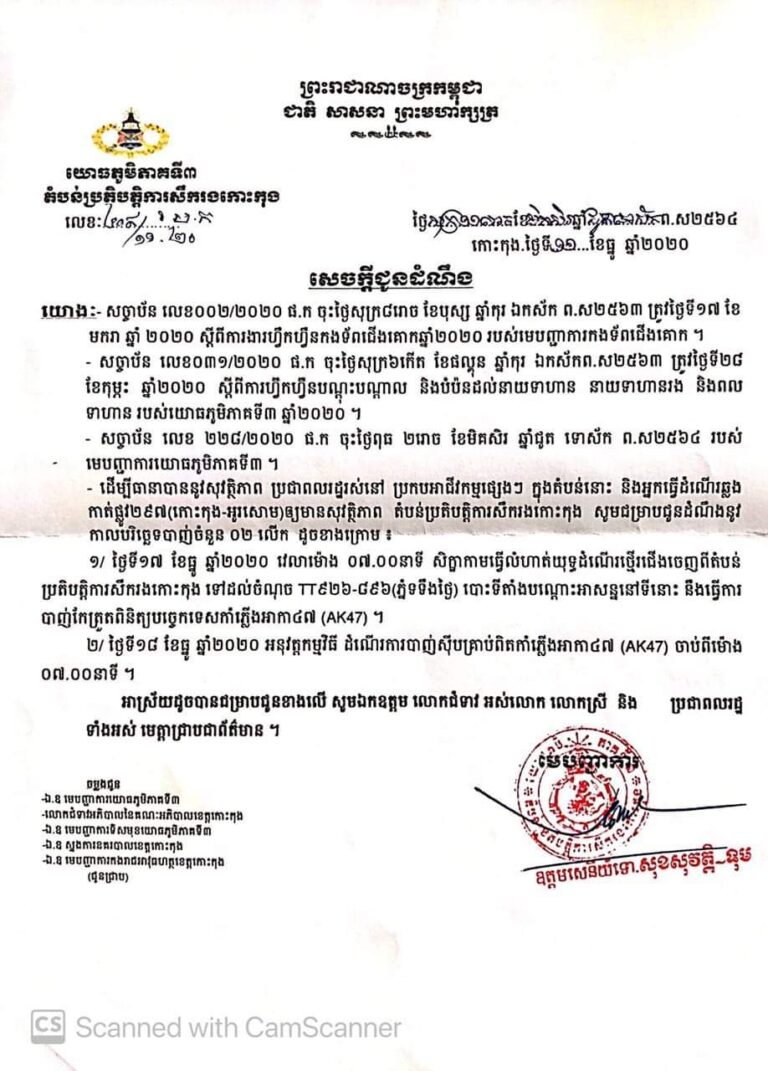 សេចក្តីជូនដំណឹង របស់តំបន់ប្រតិបត្តិការសឹករងខេត្តកោះកុង