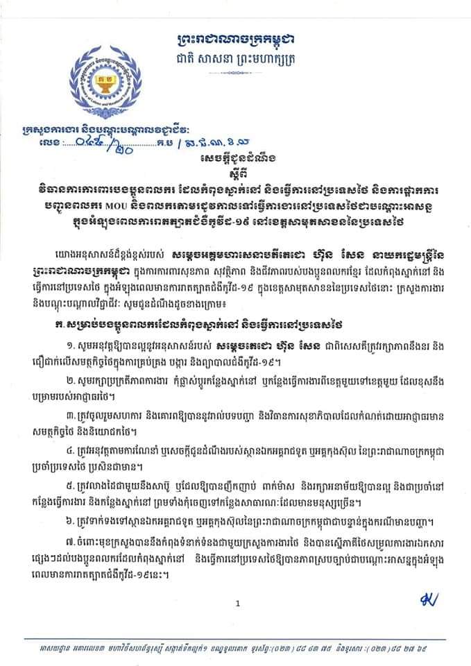 សេចក្តីជូនដំណឹងស្តីពីវិធានការការពារបងប្អូនពលករ ដែលកំពុងស្នាក់នៅ និងធ្វើការនៅប្រទេសថៃ
