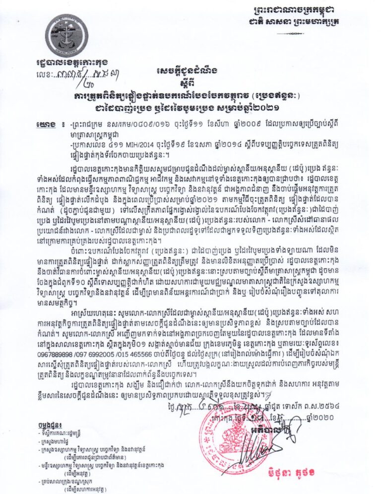 សេចក្តីជូនដំណឹងរបស់រដ្ឋបាលខេត្តកោះកុង ស្តីពីការត្រួតពិនិត្យផ្ទៀងផ្ទាត់ឧបករណ៍បែងចែកវត្ថុរាវ
