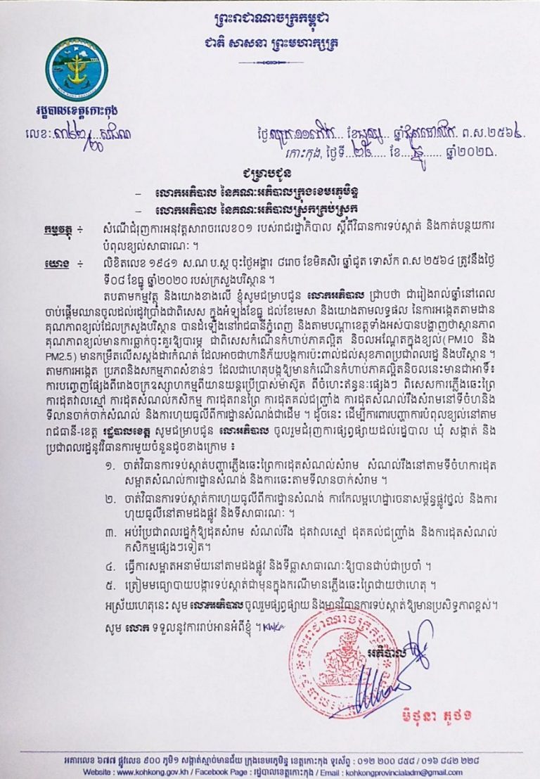 សំណើជំរុញការអនុវត្តសារាចរលេខ០១ របស់រាជរដ្ឋាភិបាល ស្តីពីវិធានការទប់ស្កាត់ និងកាត់បន្ថយការ បំពុលខ្យល់សាធារណៈ