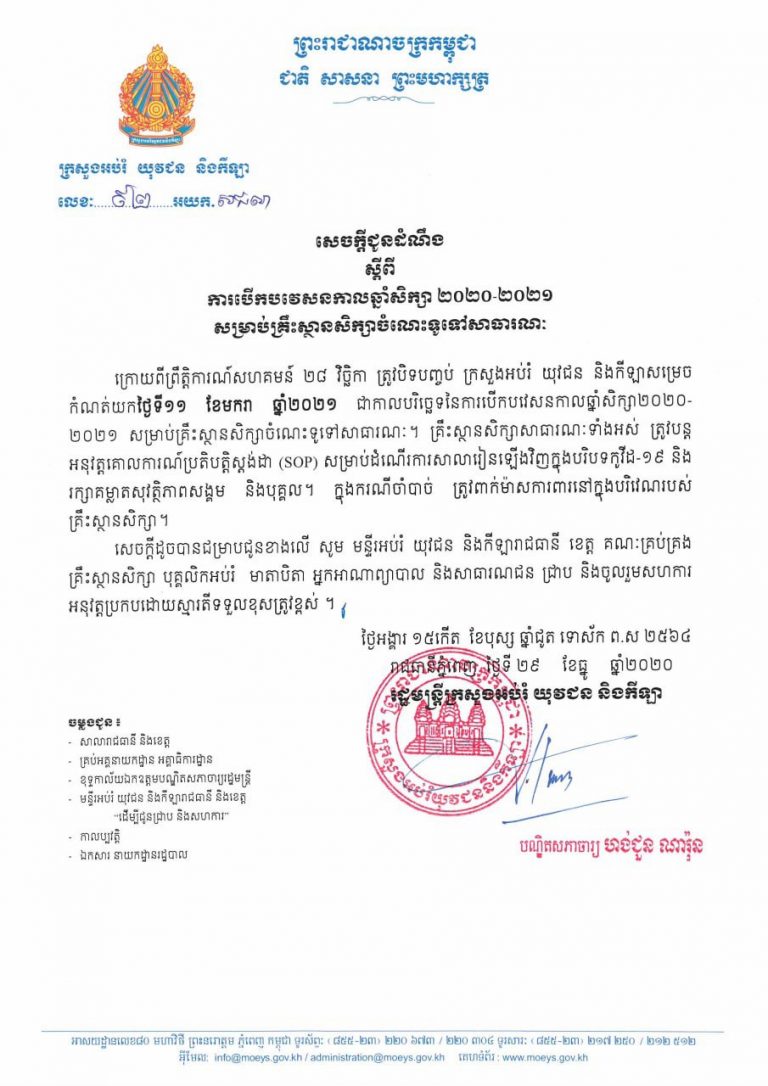 សេចក្តីជូនដំណឹងស្ដីពីការបើកបវេសនកាលទាំងគ្រឹះស្ថានសិក្សារដ្ឋនិងគ្រឹះស្ថានសិក្សាឯកជន សម្រាប់ឆ្នាំសិក្សា ២០២០-២០២១
