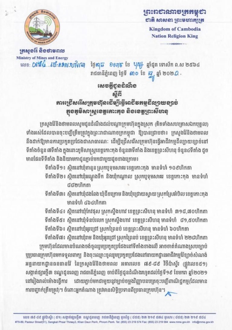 សេចក្តីជូនដំណឹង ស្តីពីការជ្រើសរើសក្រុមហ៊ុនដើម្បីធ្វើអាជីវកម្មដីល្បាយខ្សាច់ក្នុងភូមិសាស្ត្រខេត្តកោះកុង និងខេត្តព្រះសីហនុ