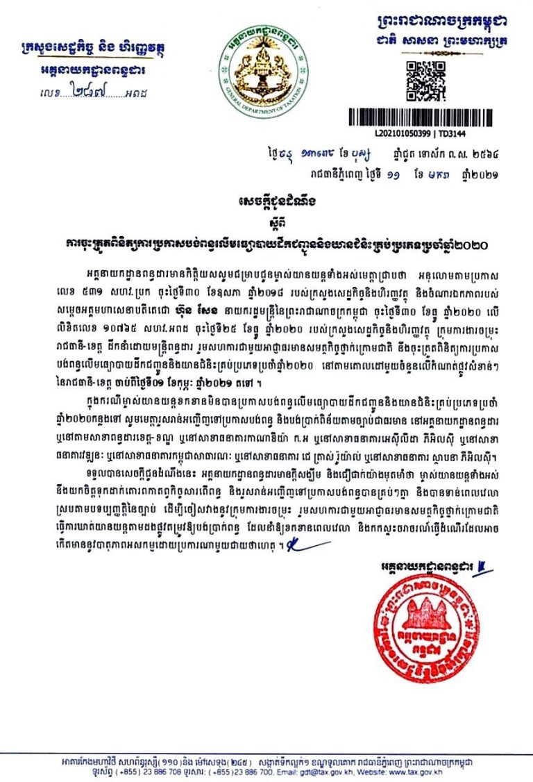 សេចក្តីជូនដំណឹង ស្តីពីការចុះត្រួតពិនិត្យការប្រកាសបង់ពន្ធលើមធ្យោបាយដឹកជញ្ជូន និងយានជំនិះគ្រប់ប្រភេទប្រចាំឆ្នាំ២០២០