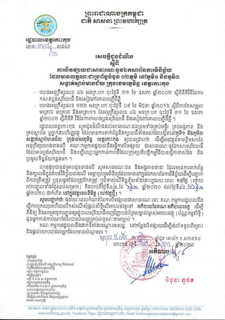 សេចក្ដីជូនដំណឹងស្ដីពីការបិទផ្សាយជាសាធារណៈនូវឯកសារនៃការវិនិច្ឆ័យដែលមានលក្ខណៈជាប្រព័ន្ធចំនួន ០២ភូមិ នៅភូមិ១ និងភូមិ៣សង្កាត់ស្មាច់មានជ័យ ក្រុងខេមរភូមិន្ទ ខេត្តកោះកុង