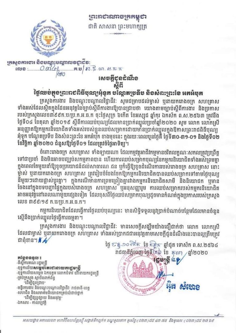 សេចក្តីជូនដំណឹង ស្តីពីថ្ងៃឈប់ក្នុងព្រះរាជពិធីបុណ្យអុំទូក បណ្តែតប្រទីប និងសំពះព្រះខែ អកអំបុក