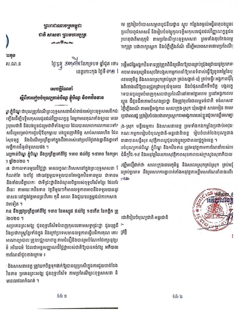 សេចក្តីណែនាំ ស្តីពីការរៀបចំបុណ្យកាន់បិណ្ឌ ភ្ជំបិណ្ឌ និងកឋិនទាន
