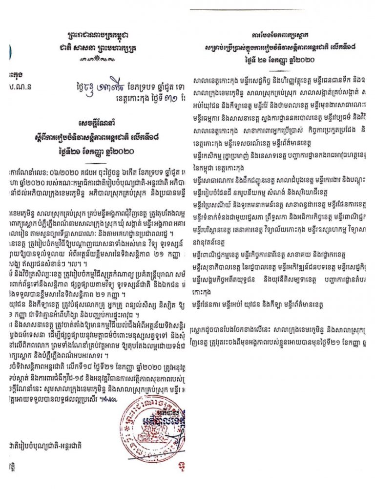 សេចក្តីណែនាំ ស្តីពីការរៀបចំទិវាសន្តិភាពអន្តរជាតិ លើកទី១៨ ថ្ងៃទី២១ ខែកញ្ញា ឆ្នាំ២០២០