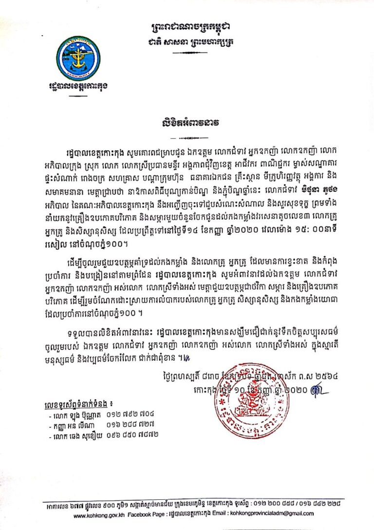 លិខិតអំពាវនាវ របស់រដ្ឋបាលខេត្តកោះកុង