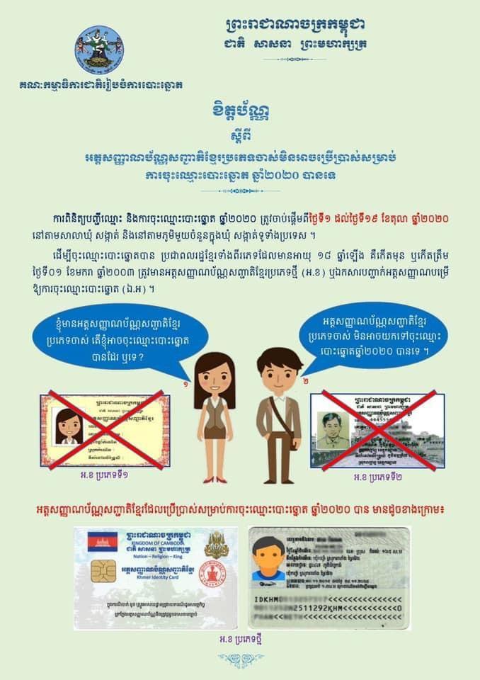 គ.ជ.ប បញ្ជាក់ថា អត្តសញ្ញាណប័ណ្ណសញ្ជាតិខ្មែរប្រភេទចាស់ មិនអាចប្រើប្រាស់សម្រាប់ ការចុះឈ្មោះបោះឆ្នោត ឆ្នាំ២០២០ បានទេ