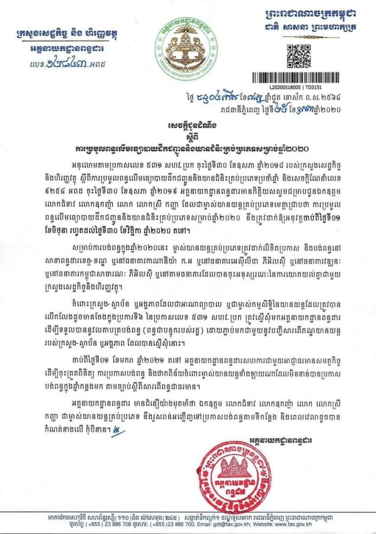 ការប្រមូលពន្ធលើមធ្យោបាយដឹកជញ្ជូន និងយានជំនិះគ្រប់ប្រភេទសម្រាប់ឆ្នាំ២០២០ នឹងត្រូវដាក់ឲ្យអនុវត្តចាប់ពីថ្ងៃទី០១ ខែមិថុនា រហូតដល់ថ្ងៃទី៣០ ខែវិច្ឆិកា ឆ្នាំ២០២០