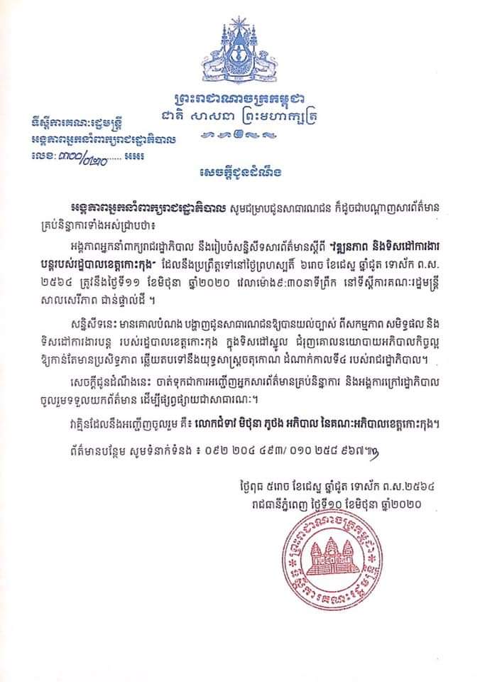 សេចក្តីជូនដំណឹង : នៅថ្ងៃព្រហស្បតិ៍ ទី១១ ខែមិថុនា ឆ្នាំ២០២០ វេលាម៉ោង៩ៈ៣០នាទីព្រឹក អង្គភាពអ្នកនាំពាក្យរាជរដ្ឋាភិបាល នឹងរៀបចំសន្និសទីសារព័ត៌មានស្តីពី «វឌ្ឍនភាព និងទិសដៅការងារបន្តរបស់រដ្ឋបាលខេត្តកោះកុង» ។