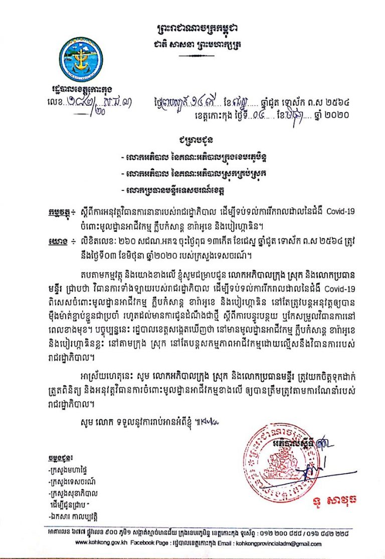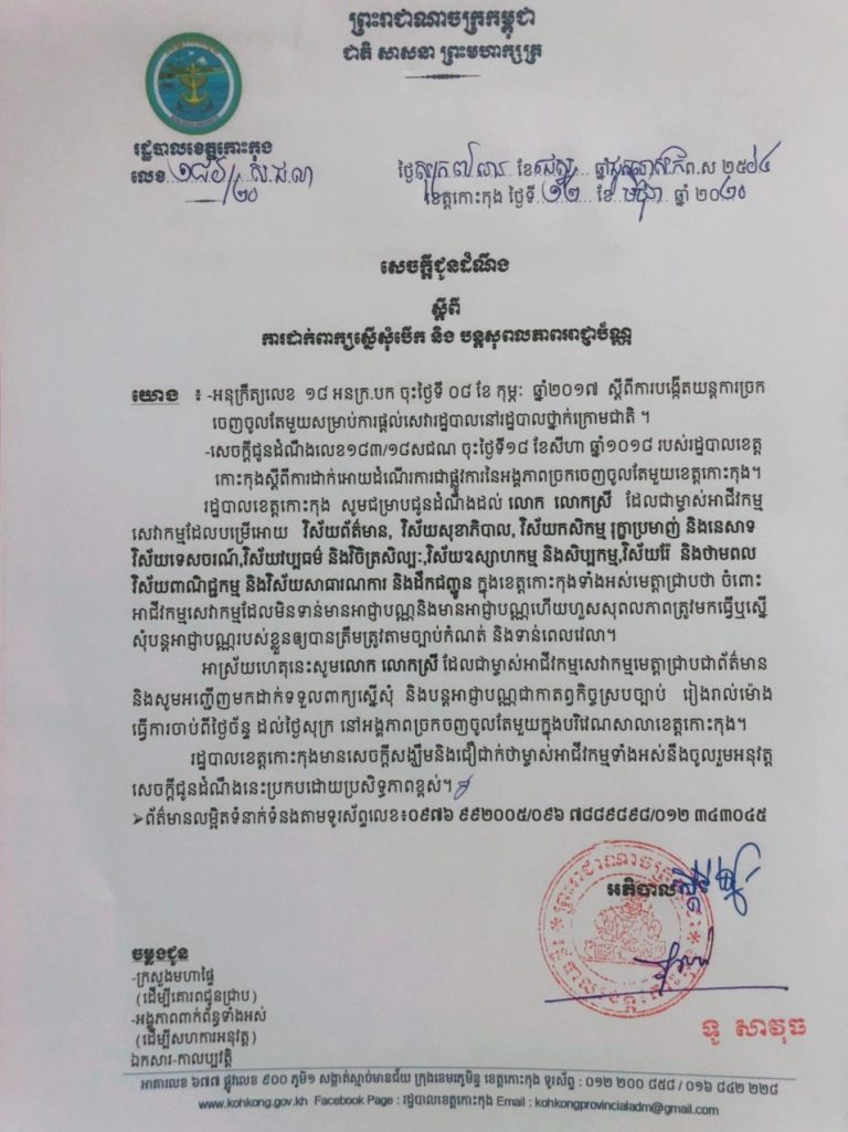 សេចក្តីជូនដំណឹង របស់រដ្ឋបាលខេត្តកោះកុង ស្តីពីការអនុវត្តវិធានការនានា របស់រាជរដ្ឋាភិបាល ដើម្បីទប់ទល់ការរីករាលដាល នៃជំងឺ Covid-19 ចំពោះមូលដ្ឋានអាជីវកម្ម ក្លឹបកំសាន្ត ខារ៉ាអូខេ និងបៀរហ្កាឌិន។