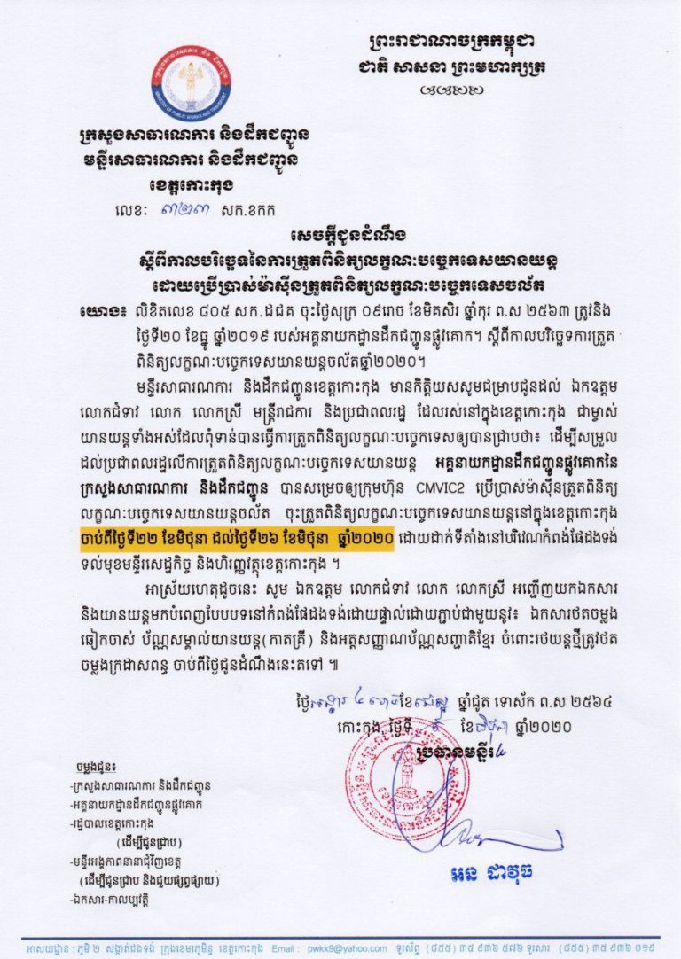 សេចក្តីជូនដំណឹង ស្តីពីកាលបរិច្ឆេទនៃការត្រួតពិនិត្យលក្ខណៈបច្ចេកទេសយានយន្ត ដោយប្រើប្រាស់ម៉ាស៊ីនត្រួតពិនិត្យលក្ខណៈបច្ចេកទេសចល័ត