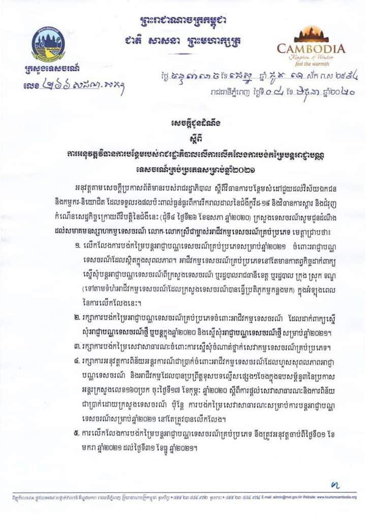 សេចក្តីជូនដំណឹង ស្ដីពីការអនុវត្តវិធានការបន្ថែមរបស់រាជរដ្ឋាភិបាល លើការលើកលែងបង់កម្រៃបន្តអាជ្ញាបណ្ណទេសចរណ៍ គ្រប់ប្រភេទ សម្រាប់ឆ្នាំ២០២១