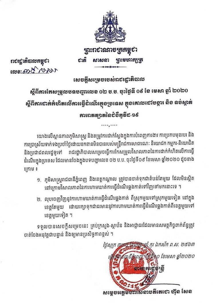 សេចក្តីសម្រេចរបស់រាជរដ្ឋាភិបាល ស្តីពីការកែសម្រួលបទបញ្ជាលេខ ០២ ប.ប ចុះថ្ងៃទី០៩ ខែមេសា ឆ្នាំ២០២០ ស្ដីពីការដាក់កំហិតលើការធ្វើដំណើរ ក្នុងប្រទេស ក្នុងគោលដៅបង្ការ និងទប់ស្កាត់ការរាតត្បាតនៃជំងឺកូវីដ១៩