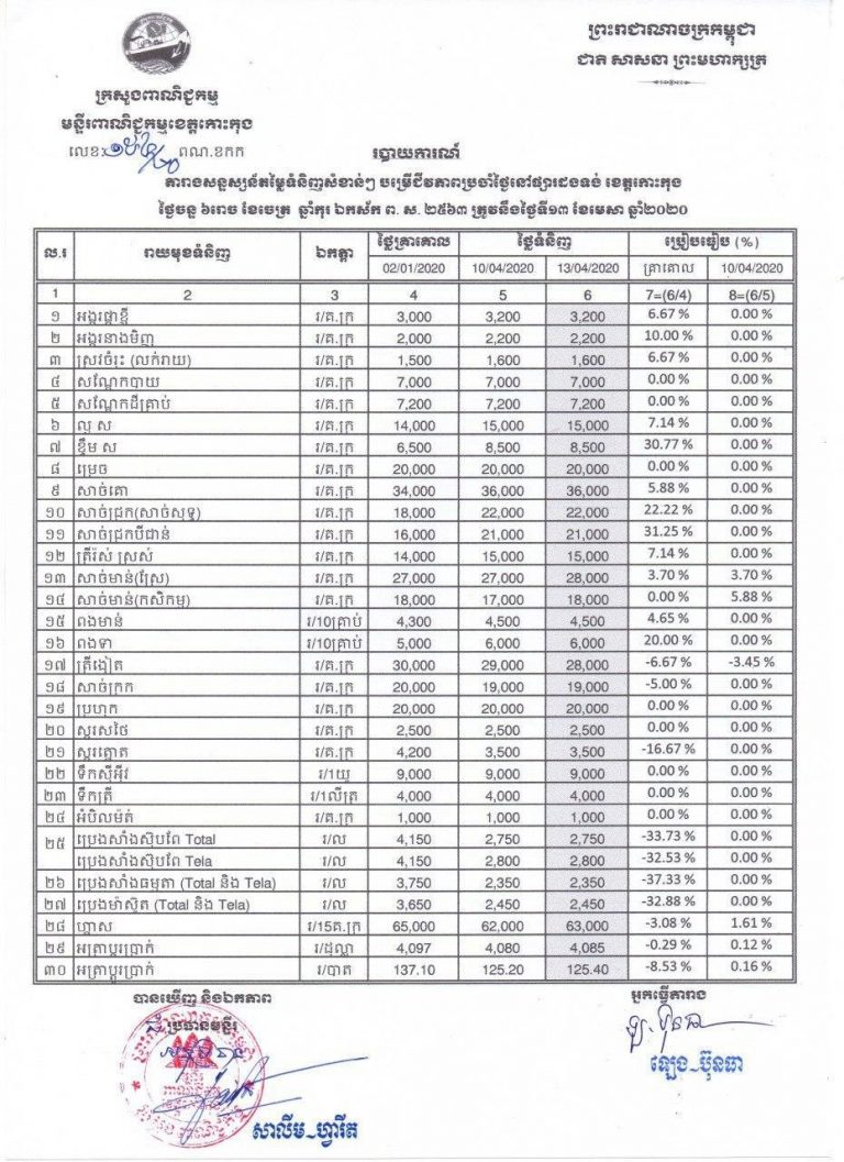 សន្ទស្សន៍តម្លៃទំនិញសំខាន់ៗ បម្រើជីវភាពប្រចាំថ្ងៃ នៅផ្សារដងទង់ ខេត្តកោះកុង ថ្ងៃទី១៣ ខែមេសា ឆ្នាំ២០២០