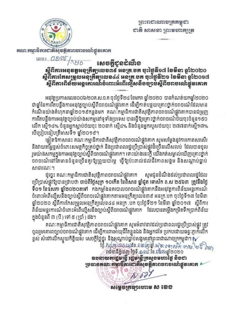 សេចក្តីជូនដំណឹង ស្តីពីការអនុវត្តអនុក្រឹត្យលេខ ៣៩ អនក្រ.បក ចុះថ្ងៃទី១៧ ខែមីនា ឆ្នាំ២០២០ ស្តីពីការកែសម្រួលអនុក្រឹត្យលេខ ៤៤ អនក្រ.បក ចុះច្ងៃទី២១ ខែមីនា ឆ្នាំ២០១៧ ស្តីពីការពិន័យអន្តរកាការណ៍ចំពោះអំពើល្មើសនឹងច្បាប់ចរាចរណ៍ផ្លូវគោក។