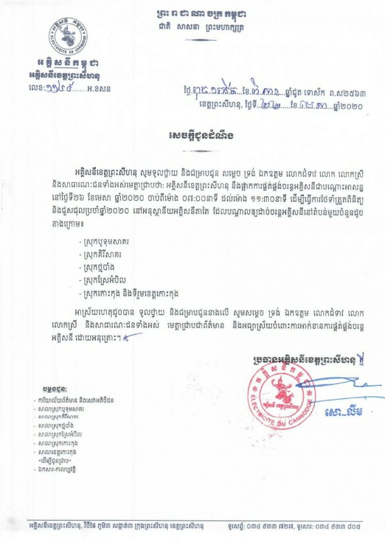 សេចក្តីជូនដំណឹង របស់អគ្គិសនីខេត្តព្រះសីហនុ ស្តីពីការផ្អាកការផ្គត់ផ្គង់ចរន្តអគ្គិសនី ជាបណ្តោះអាសន្ន នៅថ្ងៃទី២៦ ខែមេសា ឆ្នាំ២០២០