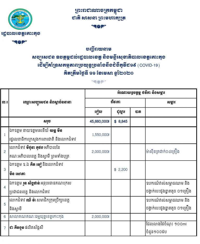 បញ្ជីរាយនាម សប្បុរសជន ឧបត្ថម្ភដល់រដ្ឋបាលខេត្ត និងមន្ទីរសុខាភិបាលខេត្តកោះកុង ដើម្បីគាំទ្រសកម្មភាពប្រយុទ្ធជំងឺកូវីដ-១៩(Covid-19) គិតត្រឹមថ្ងៃទី១១ ខែមេសា ឆ្នាំ២០២០