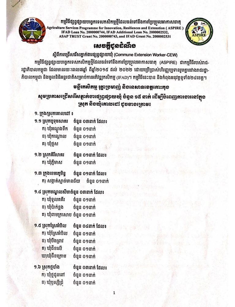 សេចក្តីជូនដំណឹង ស្តីពីការជ្រើសរើសភ្នាក់ងារផ្សព្វផ្សាយឃុំ(Commune Extension Worker-CEW)