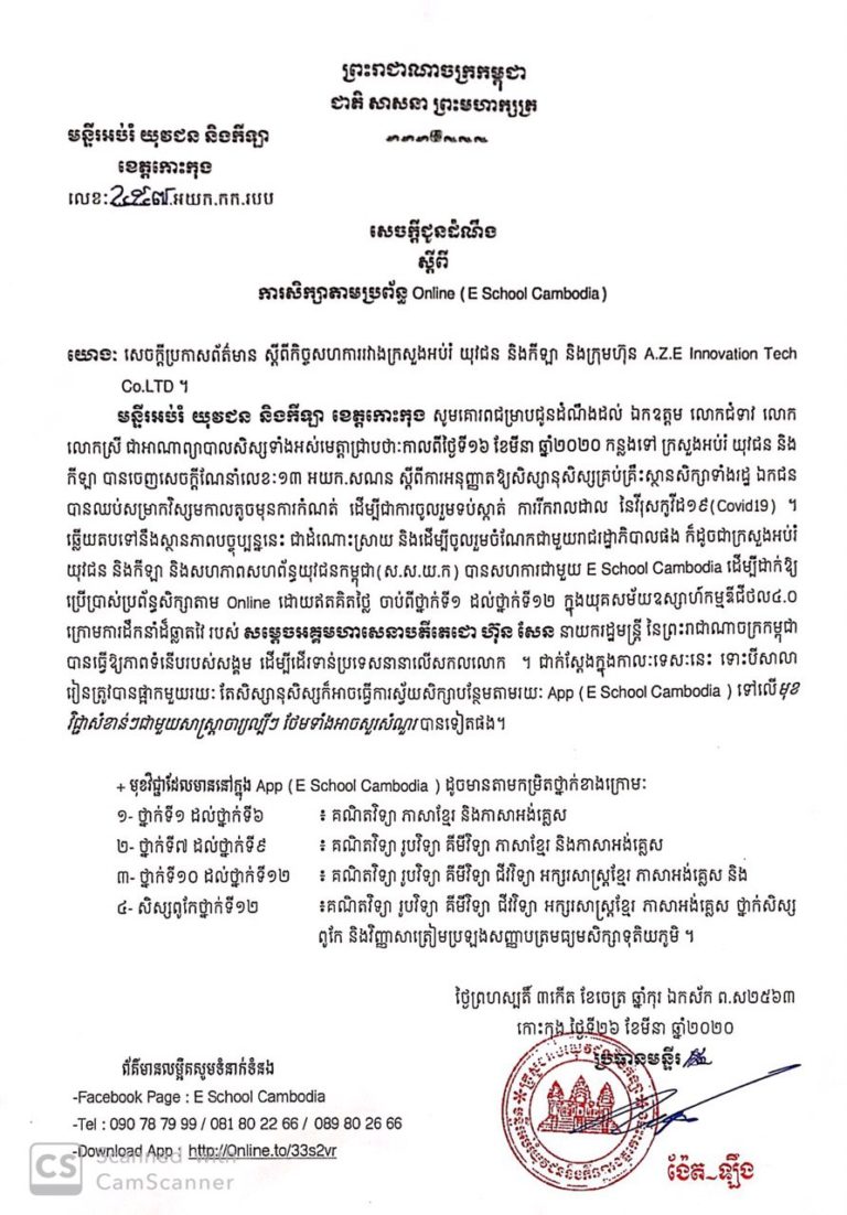 សេចក្តីជូនដំណឹង ស្តីពីការសិក្សាតាមប្រព័ន្ធ Online (E School Cambodia)
