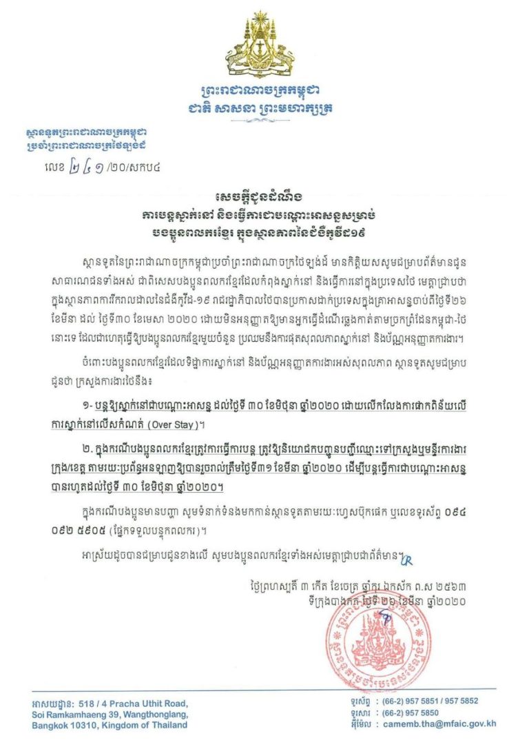 សេចក្តីជូនដំណឹង ការបន្តស្នាក់នៅ និងធ្វើការជាបណ្តោះអាសន្នសម្រាប់បងប្អូនពលករខ្មែរ ក្នុងស្ថានភាពនៃជំងឺកូវីដ១៩
