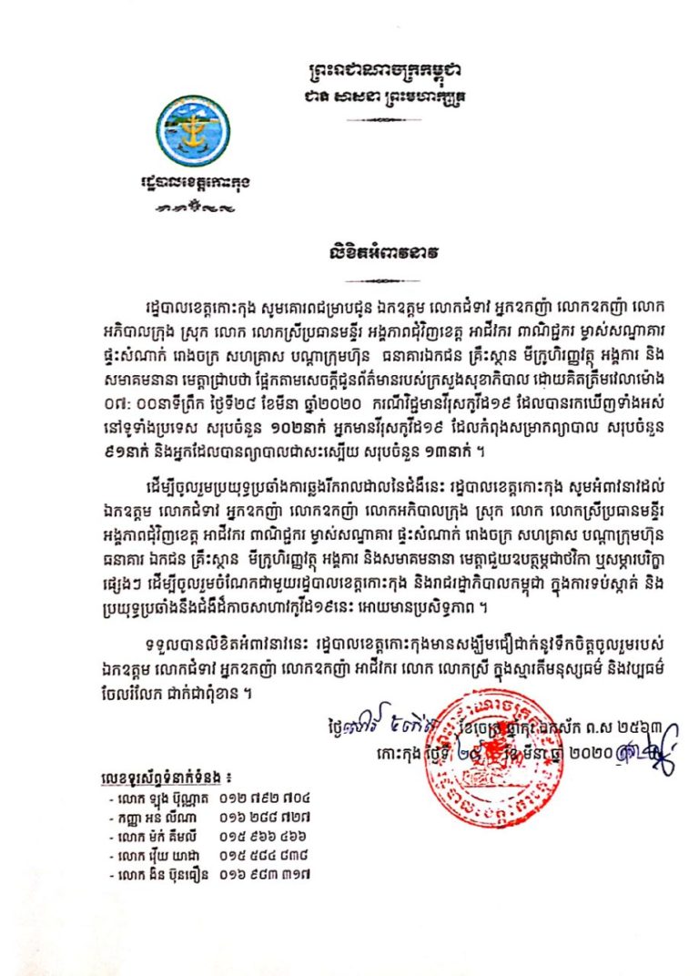 លិខិតអំពាវនាវ របស់រដ្ឋបាលខេត្តកោះកុង