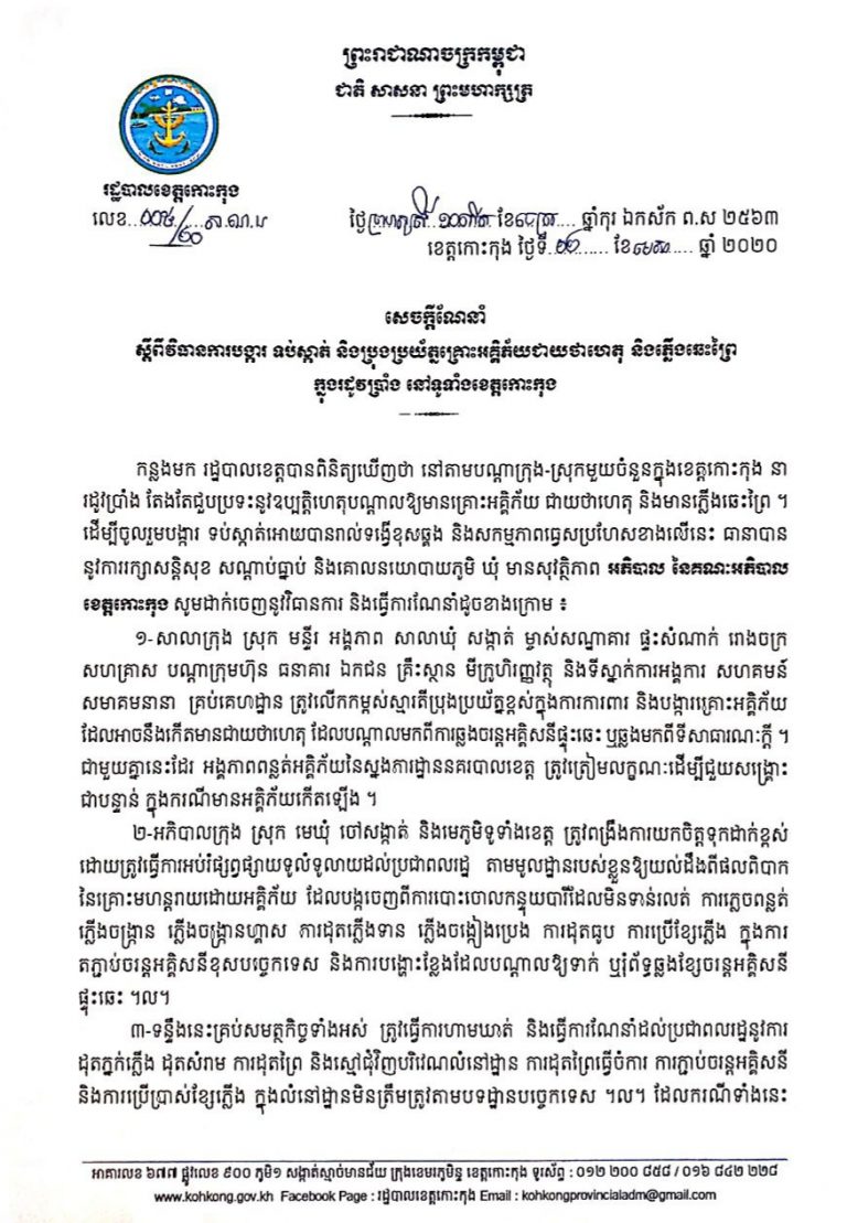 សេចក្តីណែនាំ ស្តីពីវិធានការបង្ការ ទប់ស្កាត់ និងប្រុងប្រយ័ត្នគ្រោះអគ្គិភ័យជាយថាហេតុ និងភ្លើងឆេះព្រៃ ក្នុងរដូវប្រាំង នៅទូទាំងខេត្តកោះកុង