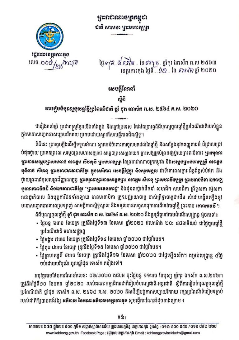 សេចក្តីណែនាំ ស្តីពីការរៀបចំបុណ្យចូលឆ្នាំថ្មីប្រពៃណីជាតិ ឆ្នាំជូត ទោស័ក ព.ស ២៥៦៤ គ.ស.២០២០