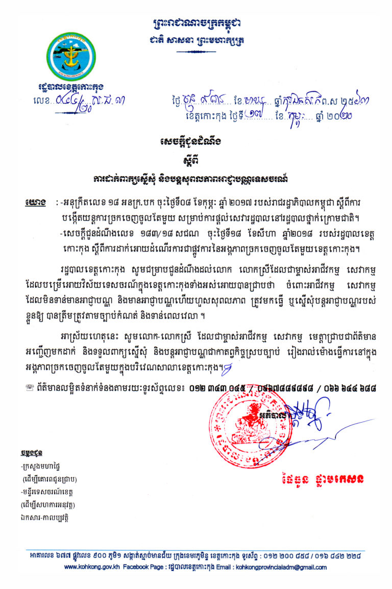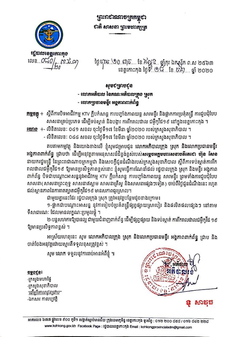 សេចក្តីជូនដំណឹង ស្តីពីការបិទអាជីវកម្ម KTV ក្លឹបកំសាន្ត ការបញ្ចាំងភាពយន្ត សារមន្ទីរ និងផ្អាកការប្រគំុតន្ត្រី ការជួបជុំបែបសាសនាគ្រប់ប្រភេទ ដើម្បីទប់ស្កាត់ និងបង្ការការរីករាលដាល ជម្ងឺកូវីដ១៩ នៅក្នុងខេត្តកោះកុង